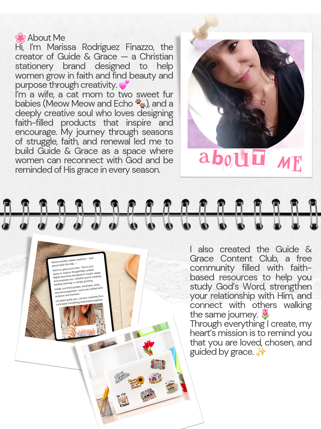 My prayer is that through Guide & Grace, you’ll find encouragement, tools, and resources that help you draw closer to the Lord. Whether you’re flipping through a notebook, sticking a verse on your laptop, or opening an email devotional, I want you to be reminded that you are never alone — God is guiding you, and His grace is more than enough.