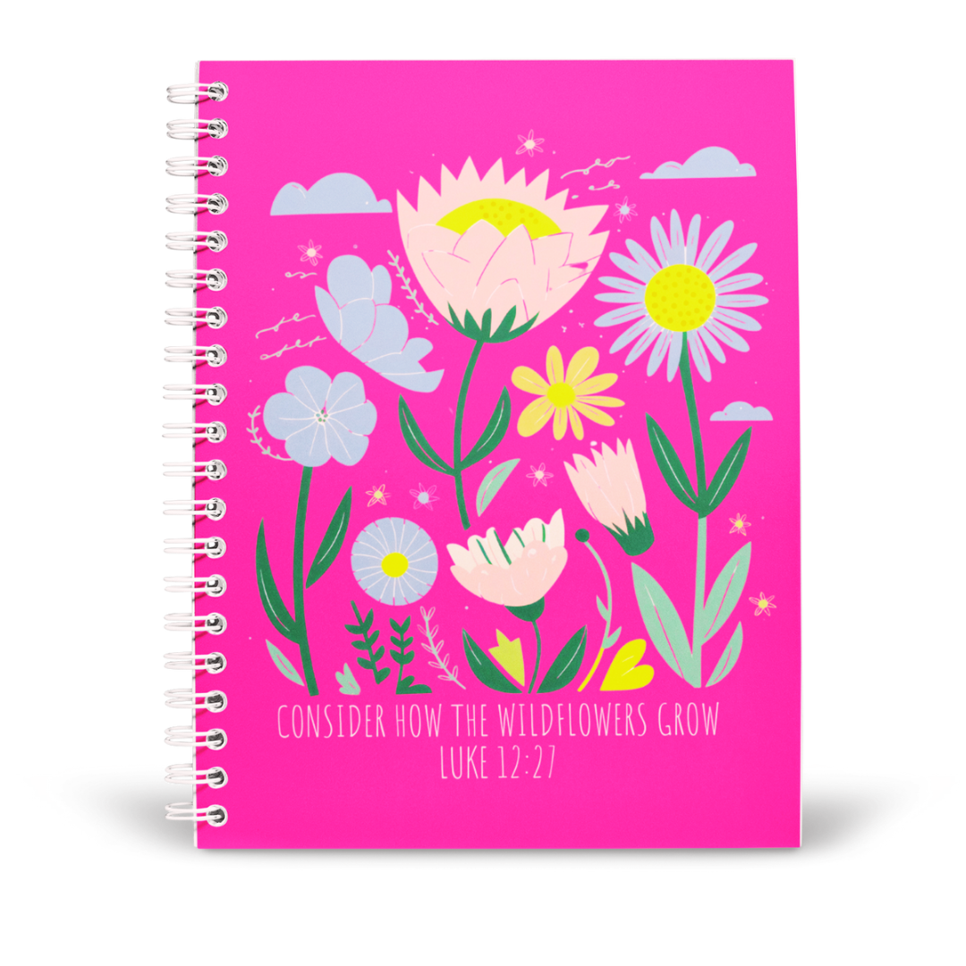 Capture your thoughts in style with the Consider The Wildflowers Notebook. This charming 8x10 softcover notebook features a crisp white spiral binding for easy flipping. Choose between Bible study pages, church notes, or classic lined paper to suit your creative or devotional needs. Perfect for jotting down inspirations, sermon insights, or daily musings with a playful touch.