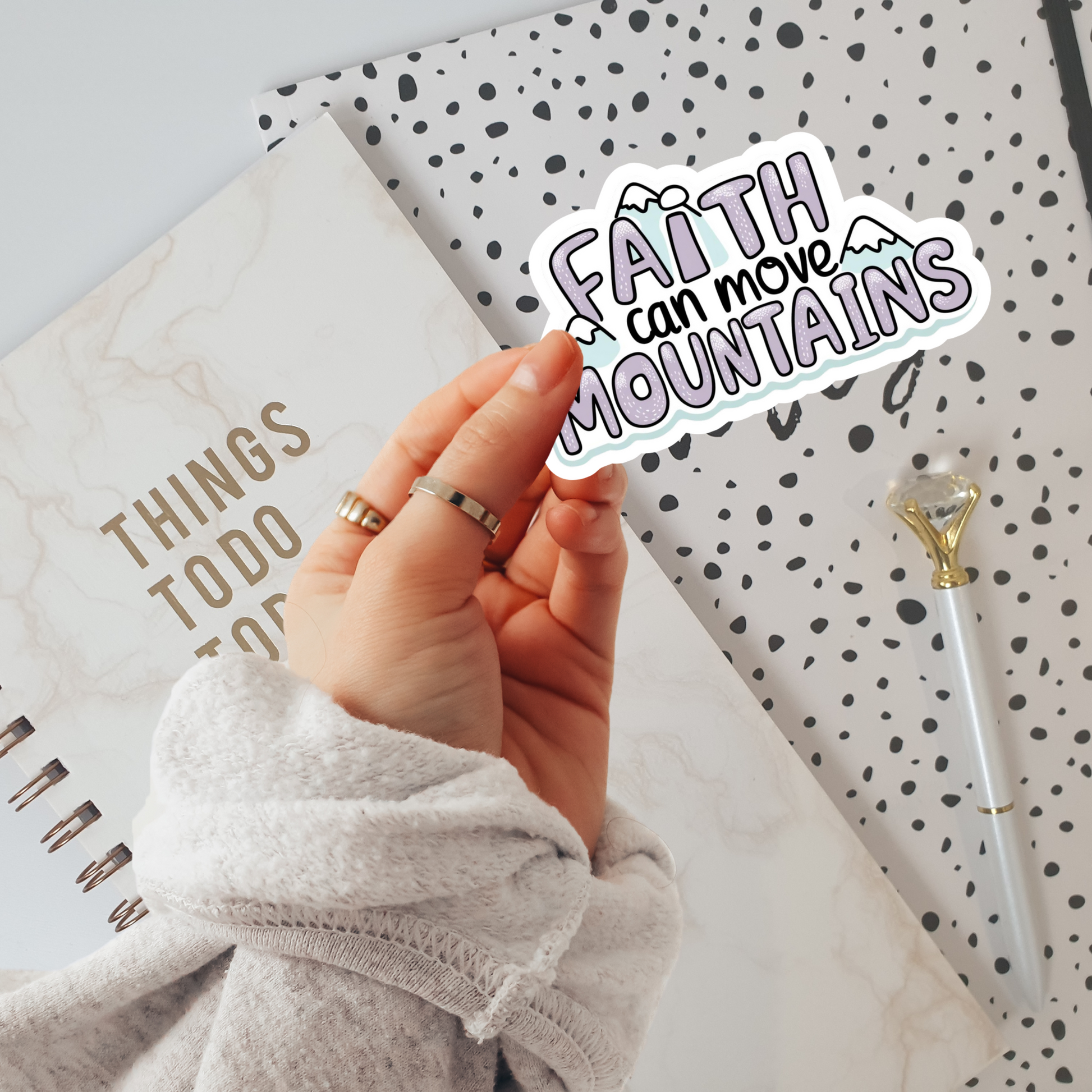Add some sparkle to your day with the Faith Can Move Mountains vinyl sticker! At 2 by 2 inches, this glittery decal brings a playful pop of inspiration to your laptop, water bottle, or planner. Let your faith shine bright and remind yourself that anything is possible—just stick it wherever you want a little extra sparkle and motivation!