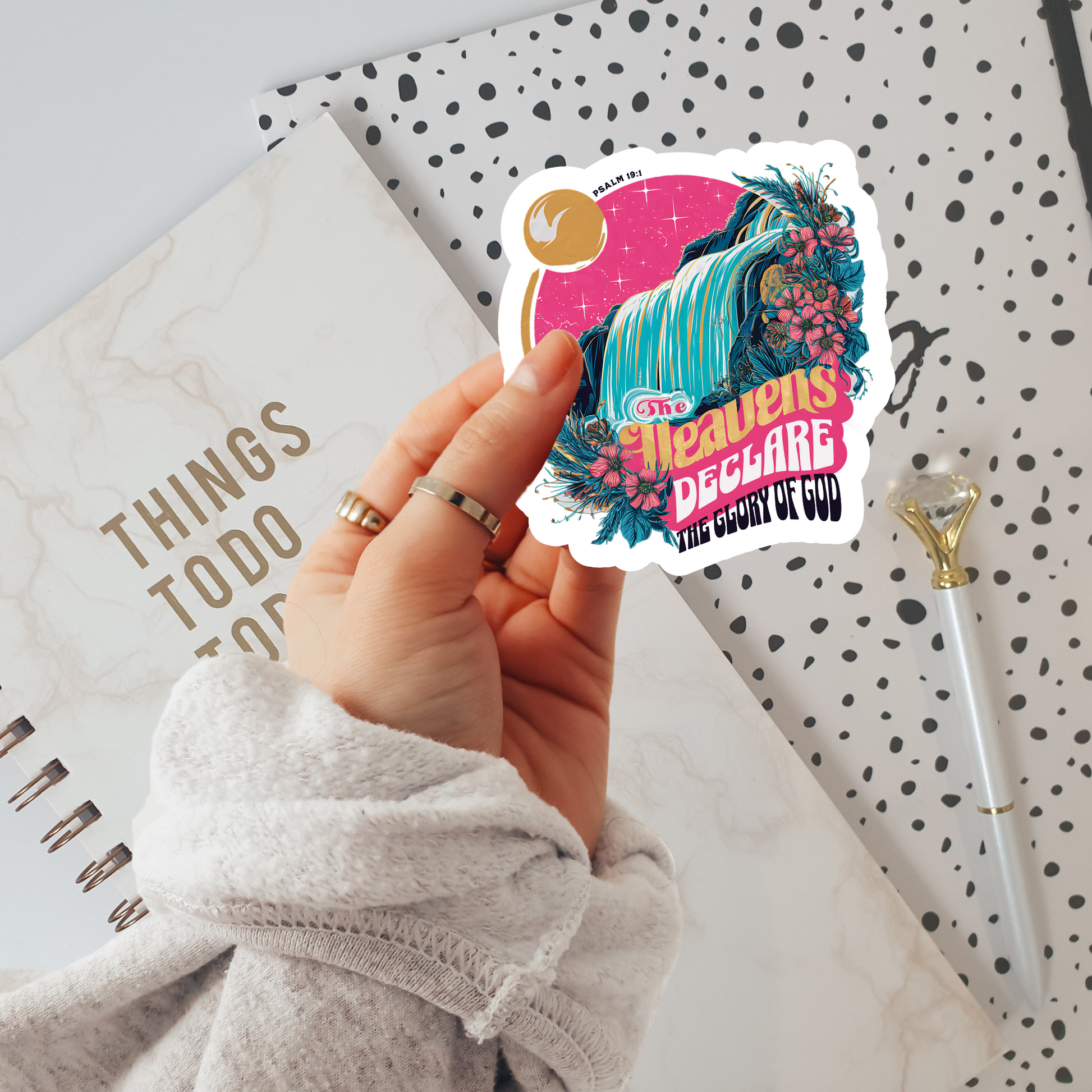 Add a sparkle of belief wherever you stick this 2 by 2 inch glitter vinyl "Heavens Declare" sticker. Its shimmering finish catches light and attention, perfect for brightening up your water bottle, laptop, or journal with a playful touch of faith. Durable and waterproof, it’s made to shine wherever you go!